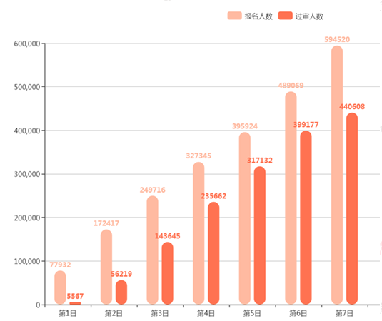 截至21日9时,2020国考经过了6天的报名后,报名系统有594520人提交报名申请,审核通过了440608人,平均竞争比为18:1,竞争力度比去年降低了一半。目前仍有350个岗位报考人数尚未破零,占2.5%。