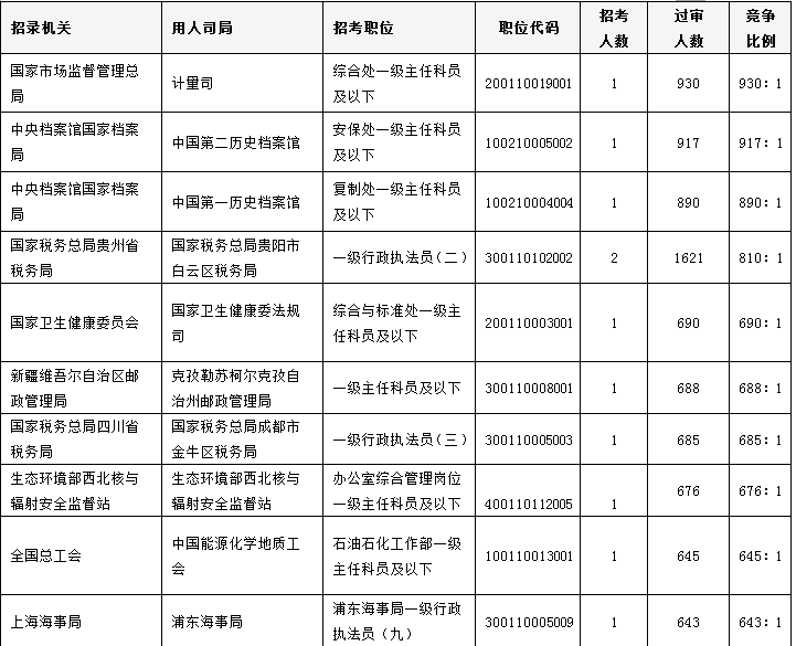 在竞争比最激烈的前十职位中,“国家市场监督管理总局计量司综合处一级主任科员及以下”这一职位以 930:1的竞争力度占据榜首。“国家卫生健康委员会国家卫生健康委法规司综合与标准处一级主任科员及以下”这一职位的过审人数进入榜单前五,在榜单前五职位中有四个职位来自中央国家机关。