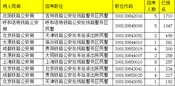 铁路公安系统从报名人数来看,“千人争一”的局面已在两个岗位中出现,分别是沈阳铁路公安局的吉林铁路公安处线路警务区民警(职位代码:300130842016)、呼和浩特铁路公安局的呼和浩特铁路公安处线路警务区民警(职位代码:300130845009),总报名人数人别是1710和1047。不过,这两个岗位的计划招录人数有5人,竞争热度实际上并没有那么高。