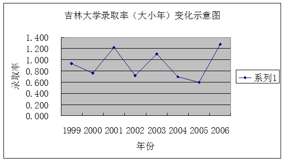 在以上图表中,我们可以一目了然的看出,录取率低的年份为该校的大年,录取率高的年份为该校的小年。并能大体预测出当年的大小年变化趋势。