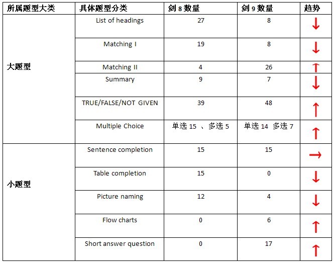 阅读部分,通过与剑8分析对比,我们总结了剑9各题型的比重,这对于2013年全年的雅思阅读题型重点起到了方向指引的作用