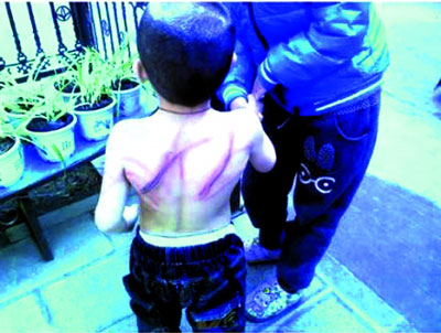 该微博说:“上午在郑州市帝湖派出所门前,有一小姑娘拉着一个五六岁的小男孩向派出所求救!男童因偷拿了家里几块钱,被爸爸脱光上衣光着身子打……背上、胳膊上一道道长长的血口映衬着男童那幼小稚嫩的后背,让人触目惊心。路人见状纷纷停下,指责男童的父亲太残忍!!真的好残忍!”