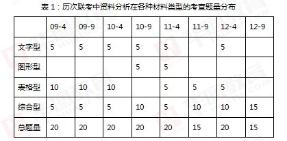 资料分析部分主要涉及三类基础类型材料:文字型、图形型、表格型,同时包含两种以上基础类型材料的称为综合型。表1为历次联考中资料分析在各种材料类型的考查题量分布表。