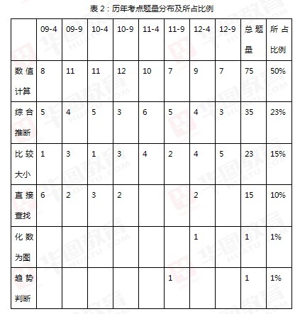 从表1中可以看出:(1)文字型材料考查较为稳定,基本上均为一篇材料5道题;(2)图形型材料单独构成考试材料的概率将会很低;(3)表格型材料以其材料类型常见、考查内容基础、涉及内容较多等特点,仍将是考查的材料类型;(4)综合型材料逐渐成为资料分析的主要资料类型,这是随着考试难度增加及考试更测重技巧性和实用性的必然结果。