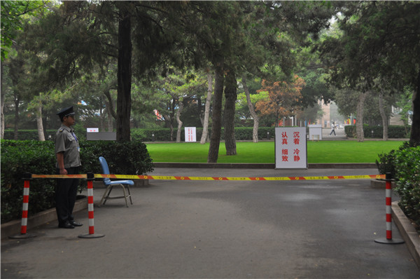 由于明天考生正式进入考场的东门已经封闭,记者只能从南门进入人大附中。远远就能看到悬挂在一栋红楼上的“全国统一高考中国人民大学附属中学考点”的条幅。高考考点设在高中部教学楼,教学楼四周已经拉起警戒线,保安已经到位,严阵以待。楼门口,树起了几块大大的提示牌,提醒考生考试安排和考场规则,而存包处被安排在旁边的实验楼,并设置了专人看管。