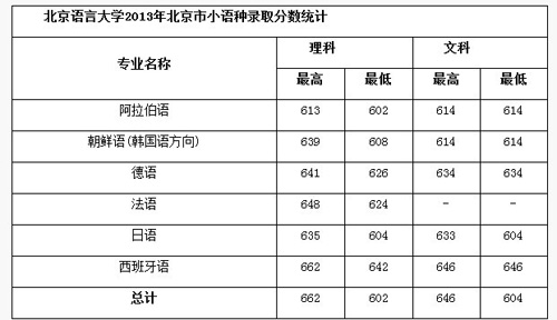 北京语言大学2013年北京市小语种录取工作日前圆满结束。据悉,今年该校北京市小语种录取分专业按照总分排队,择优录取。最终录取34人,录取理科最高为662分、最低602分,文科最高646分、最低604分,所有专业录取分数均在600分以上。