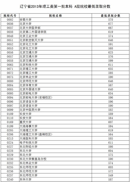 辽宁省2013年一批本科A段最低录取分数线(理)