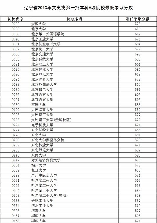 辽宁省2013年一批本科A段最低录取分数线(文)