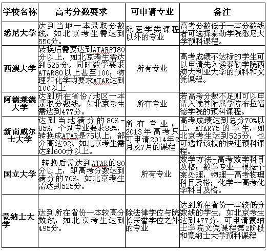 澳大利亚国立大学则是将中国的高考分数折算成澳洲的ATAR 成绩,再对照相关本科专业的入学要求。不同的专业要求可能会有所差别,但都是ATAR80分以上,即高考分数达到满分的70%。例如,2013年北京地区的学生,需要高考成绩达到525分。若高考分数低于这一要求,则可以选择澳洲国立大学的预科课程。