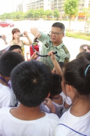 邵阳市消防支队安排的活动,与生活有关。“快看,消防叔叔把消防车升天上去了!”在酒店的后坪,小报童们观摩了消防云梯车救援、高喷车射水等演练。家长把这种体验总结为“红门生活”。随后,他们进行了消防逃生体验。