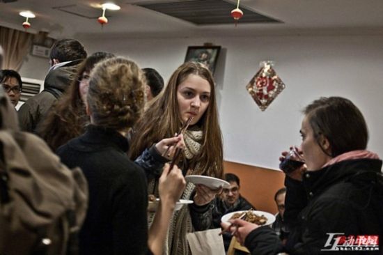 留学生迎新年聚餐会上,由于人太多,留学生们只能站着吃自助餐。每年年末,浙江大学都会为在校留学生举办迎新年聚餐会。