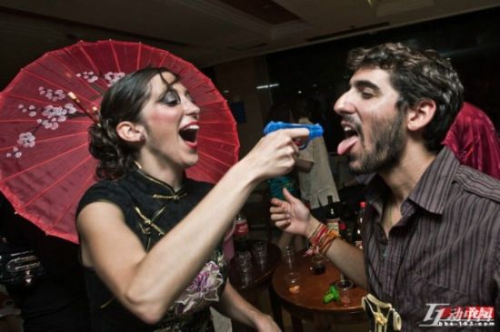 在生日派对上,意大利留学生艾莲把自己打扮的很“中国”,黑色绣花旗袍,配一把红色油纸伞,不过,她的一举一动可不像是中国古典淑女。艾莲拿着一把玩具水枪,把酒和饮料喷入同伴嘴里。