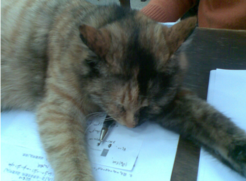 “猫馆长是一只被图书馆管理员收养的肥猫,天天在图书馆大自习室内踱步,像是在视察。同学们学习,它就在同学们的书本上睡觉有时候趴在你书上不走,你在地上放一张有字的纸,它就上去睡了,要是一张白纸,就不睡。所以好像是在学习一样,我还拍了好几张照片呢!它跑我书上,弄都弄不走。然后我在地上放了一张有字的草稿纸,它就跑上去睡觉了,我还摸了它呢!”