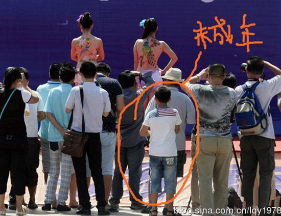 难道是中国人的性观念不开放?开始践行性教育从娃娃抓起了吗?试想下,让一个幼儿园的孩子看着一群女人穿着内衣在台上大摇大摆;让她看着一个只穿着薄薄内裤的女孩坐在众人面前被人涂鸦,她那个小脑袋里会怎么想,咦,老师不是说了要讲文明吗,咋这个姐姐不穿衣服就出来了,真是不怕羞。可又看到那么多人给她们拍照,那么多闪光灯咔嚓作响,小脑袋肯定混乱起来,你说她们丑、不讲文明,可咋那么多人还争着与她们合影呢。唉,到底是不穿衣服是文明的、还是穿衣服是文明的呢?