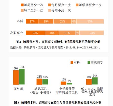 在被调查的本科生中,36%与任课教师每个月都有联系,高职高专生的该比例为43%。同时,35%的本科生和31%的高职高专生与任课教师每年联系不到一次。