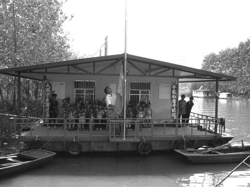 9月1日,在山东省济宁市微山县高楼乡微西小学,40名学生一位老师在船上举行开学典礼。
