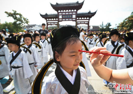 9月1日,南京夫子庙小学一年级的新生在夫子庙广场上举行“开笔破蒙”典礼,新同学向孔子像行礼、诵读《论语》、学写“人”字、敲启蒙钟、并按传统习俗在孩子们的额头正中点上朱砂,接受“尚礼”传统文化教育和师长祝愿,由此正式成为一名学生。