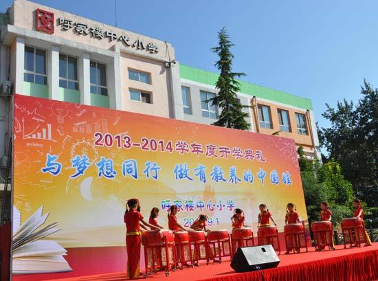 9月1日,呼家楼中心小学举行开学典礼,从维也纳金色大厅表演归来的同学们表演打击乐节目。