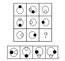 这道题目中出现了实心圆、小空心圆和大空心圆三种元素。我们需要按行逐一看各个元素的变化规律。首先大家会发现大空心圆是保持不变的,所以大空心圆不用考虑其规律。其次看实心圆与大空心圆的位置关系为相切和相交两种状态,且实心圆在每行中只出现两次。最后看小空心圆与大空心圆的位置关系也为相切和相交两种状态,且实心圆在每行中也只出现两次。这就是此题的规律。正确答案选C选项。