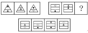 看到这道题,许多考生会立刻想到元素向上位移,但是如果运用 “分开看原则”后就会发现问题。首先观察小三角的运动方式,小三角在第一组的第一个图形和第二个图形中逐步上移一步,但是到第三个图形中就消失了,说明此题考查的不是元素的位移。将第一组的三幅图连起来看就会发现小三角一共出现了两次。再看其他元素,同样也是各出现了两次。此外还有一个重要的规律,就是空白格在图形中的位置依次是中、下、上,这样我们就可以选出答案是A选项。