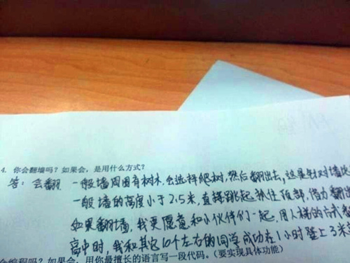 伟德国际1946bv官网北京9月27日电(欧兴荣 实习生潘金洁琼)网上一张名为《笔试题你们来感受下》的照片近日很火。据传,该照片是某网络公司招聘的笔试题,题目为:你会翻墙吗?如果会,是用什么方式?该题旨在考查应聘者通过何种方式翻越网络浏览国外网站,但一位应聘者把翻墙理解成爬墙,并声情并茂的阐述了“如果有树会依托树爬出去”甚至还会“跟小伙伴们用人梯的方式翻出去”,网友看完简直笑翻了,更有网友大呼:这么有创意的答案,一定要录取他。那些年,各种民间高手曾在试卷上为我们奉献了无数笑料,想看看都有哪些吗?现在就让小编为你盘点奇葩的考试答案!