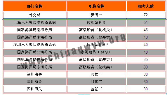 2013年国家公务员考试招录人数最多的部门是上海出入境边防检查总站的边检站科员一职招录人数最多,招录117人。教材中心人员也对2014年国家公务员考试各部门招录人数进行了统计,根据统计显示,2014年国家公务员考试招录人数最多的部门是外交部招录人数最多,招录72人。招录人数最多的10个职位招录人数如下表: