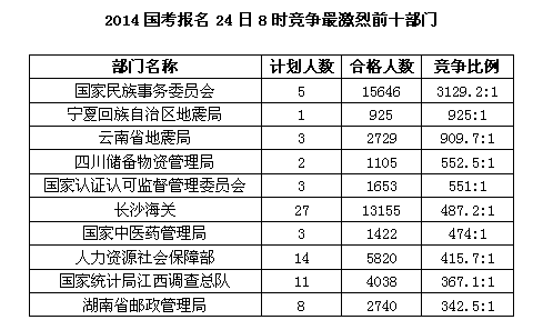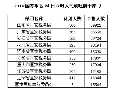 据统计,在各部门中连续几天稳坐头把交椅的山东省国家税务局通过审核人数接近4万人。不过由于计划人数较多,国税局各部门热度虽高,竞争倒不算特别激烈。而另外一些部门由于计划人数有限,合格人数虽然相对国税少,竞争比例却相当高。另一方面,相对于一些职位千里挑一的盛况,截止到10月24日上午10时,国务院系统参照公务员管理法管理事业单位有37个职位零报考,中央国家行政机关直属机构(省级及以下)尚有94个职位无人报考。考生在报考时应对一系列数据进行综合考量。