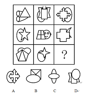 【解析】这道题考查的是曲直性。直接通过题干并不能十分直观地分析出规律,但同时观察选项就会发现每一个图形都是由两个小图形组成,组成比较相似,而且BCD三个选项都有一个椭圆压在另一个图形上方,再看题干会发现,所给出的八个图形都是直线图形压在曲线图形上方,选项中只有A选项符合这个条件,所以选择A选项。