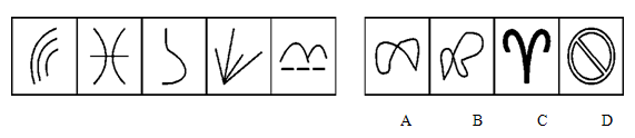 【解析】这道题考查的是封闭性。根据题干很难找到规律,仅能观察出图形间差异较大,而具体是何种规律还需要深入挖掘,但通过分析选项就比较容易看出区别。观察选项寻找特殊图形就会发现ABD都是封闭图形,只有C选项是开放图形,再回头来看题干,发现题干也都是开放图形。这就是通过特殊图形区分选项之后再进行代入验证,所以选择C选项。