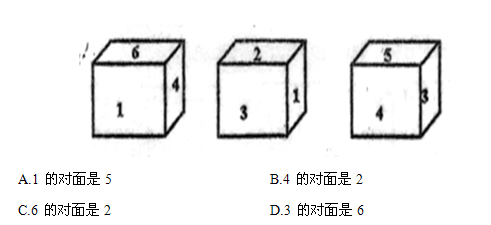 【例4】有一个立方体,每个面上分别写上数字l、2、3、4、5、6,有3 个人从不同角度观察的结果如下图所示,对这个立方体的每一个数字的对面的数字推断不正确的是( )