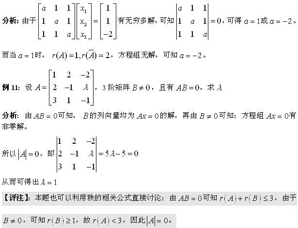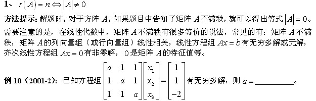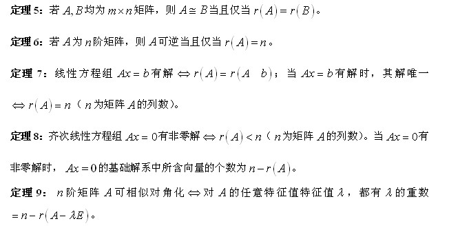 线性代数中大多数重要的定理都与秩有关,我们在这里将其中主要的定理进行简单的总结,以便于考生系统地掌握,具体的内容在相关的章节还会有详细的讨论: