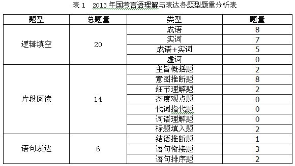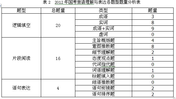 根据表1的汇总信息,2013年的言语理解与表达有一下特点:首先,在逻辑填空中没有出现虚词的考察题目,成语和实词的考查已然是重点内容。。其次,在片段阅读中,注意概括题、意图推断题和细节理解题这三个必考题型的总题量稳定,但是减少了对主旨的考查,增加了意图题的题量。最后,在语句表达中,语句排序题出现两道,已然成为国考中的必考题型之一。