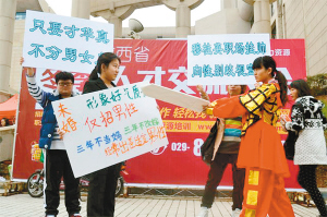 “请给我们一个公平的就业机会!”因找工作频繁遭遇性别歧视,10月10日上午,来自全国不同高校的数十名女大学生,来到陕西省体育场企业招聘会门口,设计了一场名为“穆桂英职场挂帅,向性别歧视宣战”的行为艺术活动,抗议企业设置的不公平求职门槛。