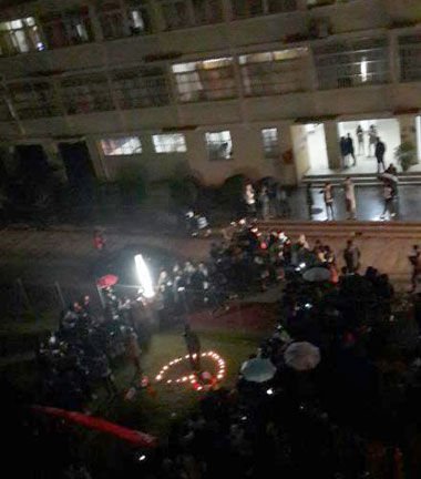 11月13日晚上,江西一高校宿舍楼下空地上,一名男生拉起条幅,点燃心形蜡烛,向一名女生示爱。这一景象引起了百余学生围观,大家纷纷帮忙一起吆喝。可惜被告白的女生最终拒绝,求爱男生遗憾离场。