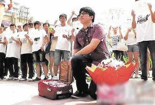 武汉男子提20万元现金当街求婚 钞票折成心形状:武汉一男子率领50人自行车队在汉口百步亭一售楼部门口当众求婚。让围观者惊诧的是,求婚男子提着一皮箱的现金求婚,据称有20万元。在现场的张先生则说,当女主角出现时,男子走到她面前,单膝跪下,打开用一只行李箱带来的特别礼物,竟是满满一箱子折成心形的百元大钞。“嫁给他!”全场人大喊着,最后两人幸福相拥。“这也未必是拜金主义,年轻人现在都喜欢玩浪漫。不过,拿着满满一整箱百元大钞求婚,我还是第一次见到。”