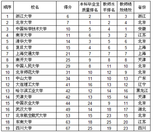 中国一流大学顺序按得分排列,得分越低排名越高。得分相同,按教师水平排序。各大学得分等于上表毕业生质量排名、教师水平排名、教师绩效排名之和。其中,武汉大学、四川大学首次进入中国一流大学。
