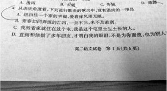 该校语文组的一位老师称:“这道题出得很新颖,熟悉的歌词却考出了扎实的语法知识,既贴近生活又考验基本功,符合高考改革方向。”