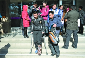 昨天,清华大学“自强计划”测试的笔试结束,一名考生前几天摔伤了脚,拄着双拐在家长的搀扶下走出考场。(本报记者 和冠欣摄)