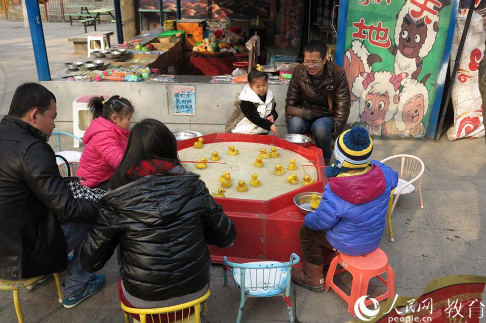 放寒假了,大人们带着小孩儿在广场上一起玩。