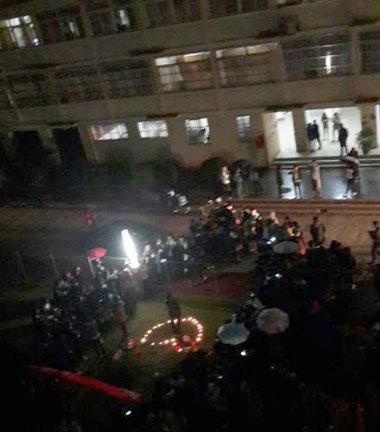 去年11月13日晚上,南昌红角洲一高校宿舍楼下空地上,一名男生拉起条幅,点燃心形蜡烛,向一名女生示爱。这一景象引起了百余学生围观,大家纷纷帮忙一起吆喝。可惜被告白的女生最终拒绝,求爱男生遗憾离场。