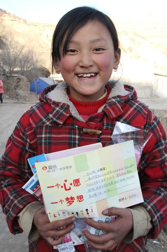 从收集上来的心愿卡可以看出孩子们的愿望并不是很大,有的想要一个玩具汽车,有的想要一本书,有的甚至只想要一把直尺……这些志愿者都看在眼里,记在心里,他们明白,每一个梦想的分量都是一样的,除了尽全力帮助他们去实现,也要让他们知道每一份收获必须有所付出。他们鼓励孩子们在心愿卡上写下自己的目标,比如:考试要得全班第一,要认识50个汉字,要好好照顾爷爷奶奶等。令志愿者欣慰的是,这一次他们再来到岷县时,已经有不少孩子得到了进步,甚至已经达到了他们的目标。途中,我们见到了一个叫崔丽霞的小女孩,她性格内向害羞,不爱说话,更不愿与志愿者进行交流。但是当志愿者看到她的心愿是有一个毛绒小熊时,就知道她是一个缺乏安全感的孩子,渴望着一份温暖。于是志愿者石天柱告诉她无论什么时候都要坚强,房子塌了可以重建,但是信念不能倒,最困难的时候有哥哥姐姐陪着你们。这时,女孩眼中的泪光是真实的,也是温暖的。通过小小的礼物让孩子们树立感恩意识,学会坚持、学会付出,懂得在付出中收获,正是这些志愿者们最大的愿望。