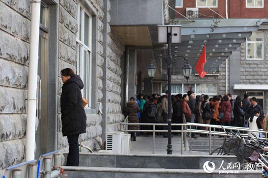考试已经开始,一位家长透过侧门向考场望去