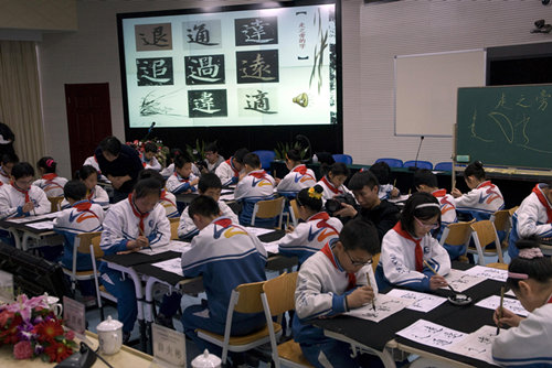 “不积跬步,无以至千里。”人生中真正的感动往往来自于对平凡事的执着,真正的欣慰往往是坚持后的喜悦。“书法有教室,写字无专时,提笔即练字,贵在能坚持。”农大附小广为传颂的这句话,折射出学校20多年跨越四季的坚持和内修。学校能够一以贯之坚持对学生进行书法教育,始终不辍。不因校舍动迁所荒废,不因领导更迭而动摇,不因师资调整而中断,不因社会时尚而迷失。在这里,书法教育营造了一个独具特色的师生儒雅、合和共进的文化环境,身在其中的每个人都充分感受着书法之韵、之美,享受着挥毫泼墨带来的惬意和美感。学校将练习书法与涵养品德紧密结合,引导学生不但手下把握汉字间架结构之美,更能心中牢固民族文化之魂,立意深远,内容具体、形式活泼,特色鲜明。午间练字十分钟、师生书法笔会、《书韵》广播体操、新生入学开笔礼、《楹联书法》国学启蒙读本首发式、迎新春写春联、社区送春联等“小书法家行动”长效机制下的各项活动……从教材、课程、师资、设备、场地、活动、实践等诸多方面构建了阶梯式、序列化的体系,打造了书香校园。
