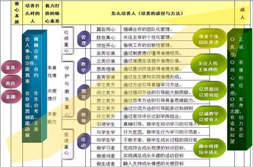 学校从管理、教学、德育、教师、学生几个方面;从引领童心、守护童心到促进童心几个角度;从培养什么样的人到怎么培养人这一教育问题的提出与回答,形成了童心教育整体性发展的理念框架。架——童心的本质即童真、善良、童趣;童心教育就是要培养会做人做事、会合作交往、能自我约束、会生存生活、会思考创造、能主动发展的人;童心教育着力打造的核心素养为率真心情、关爱德行、求索能力;通过童心管理引领童心,通过童心教学、童心德育、童心教师的塑造守护激发童心,通过童心学生的培养促进童心;最终培养出正直诚信、有同情心和责任感、有终身志趣、有创造力和求知欲望的人。