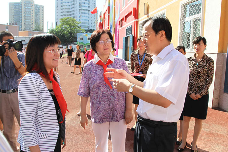 2013年8月31日,海淀区政府孙文楷区长(右一)出席人大附中实验小学开学典礼暨更名仪式并就学校工作进行指导