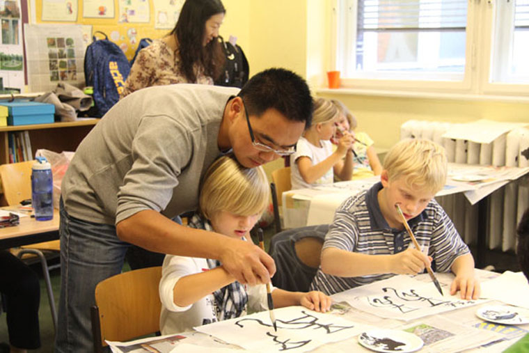 2011年9月,人大附中实验小学实验杨华老师为德国柏林维克多尔·格朗次小学同学上软笔书法课。