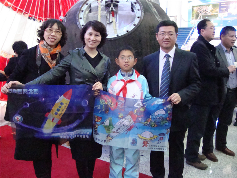王正同学主创的“航天之梦”美术作品搭载神州八号胜利返航、景小霞校长、李春洁主任、中国空间技术研究院副院长尚志伯伯在返回舱。