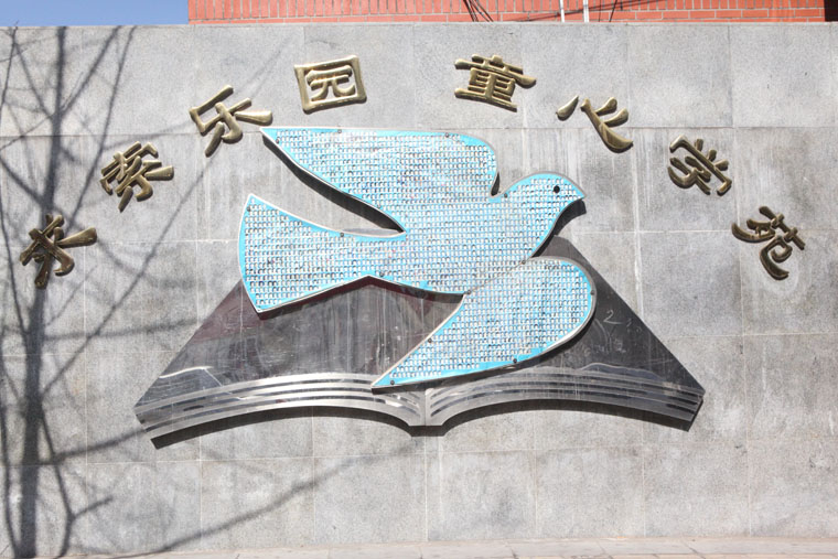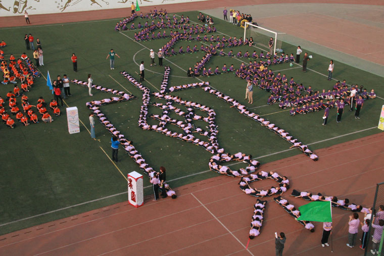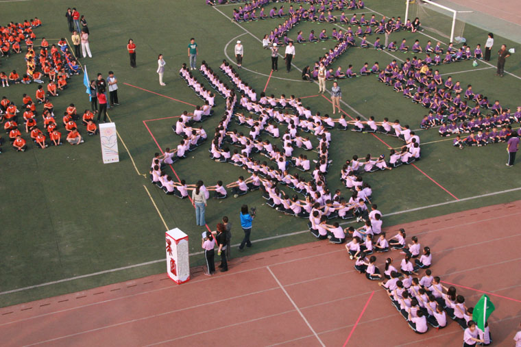 2011年9月26日,首师附小举办第一届挑战十小时活动。此图为:童心德育的群体活动展示-百人多米诺组成的求索中国结