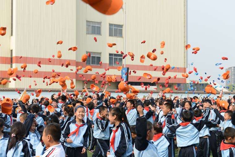 2013年5月2日,首师大附小的学生进行第二届挑战十小时活动。此图为:“人塔迷宫”闯宫结束,快乐的场景