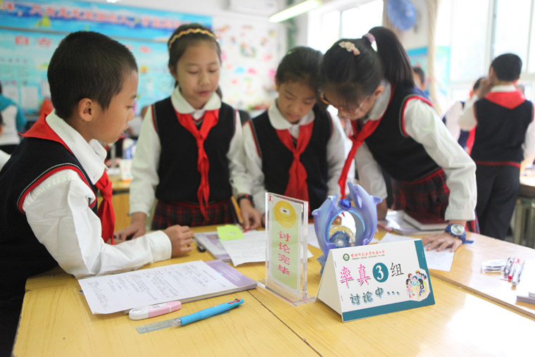 此图为:首师附小的学生在童心课堂上进行小组合作